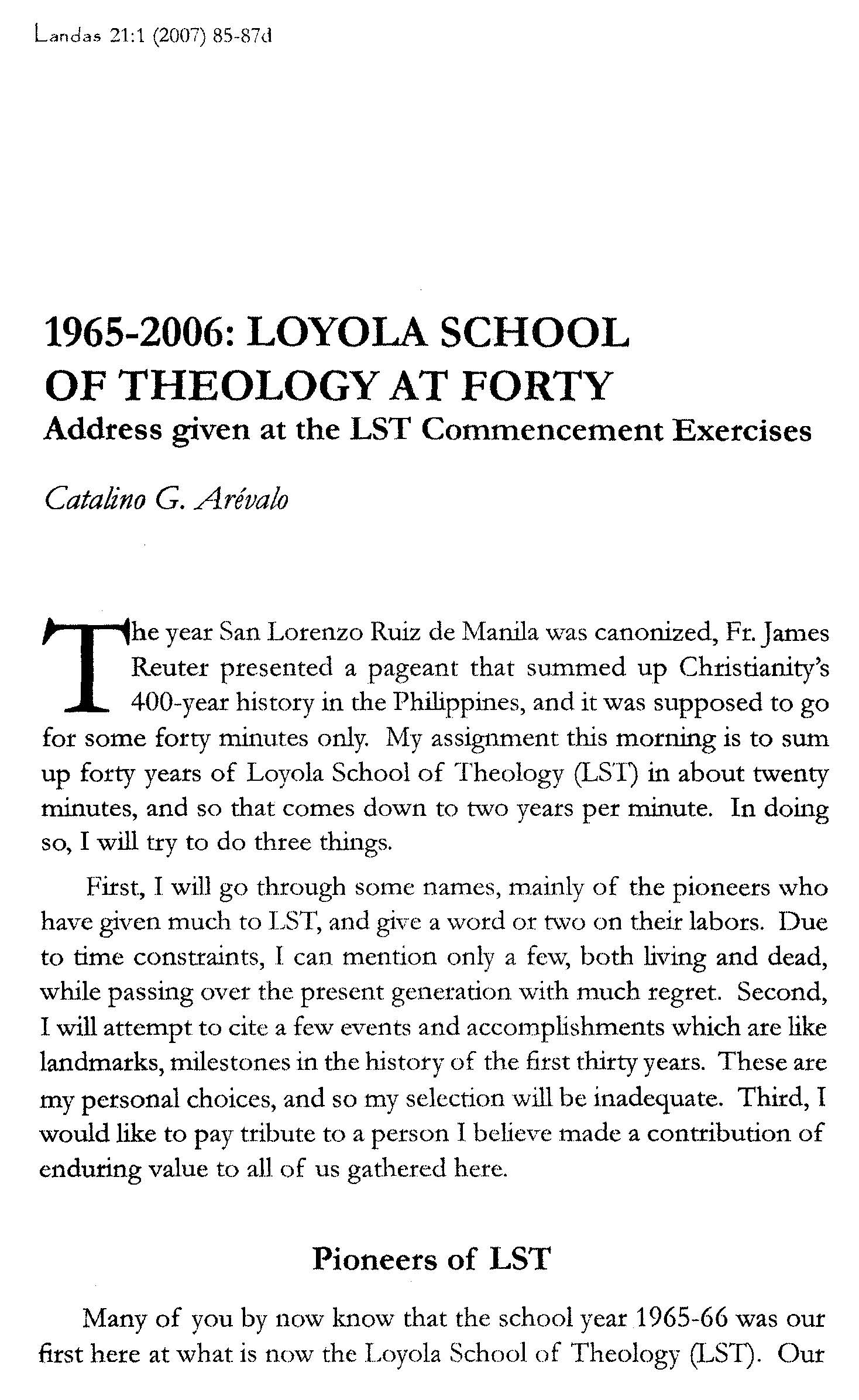 [Here is a] short piece of documentation related to the Loyola School of Theology—the commencement address delivered on March 15, 2006 by Fr. C.G. Arevalo, S.J., the first LST President. – from the Editor’s Preface