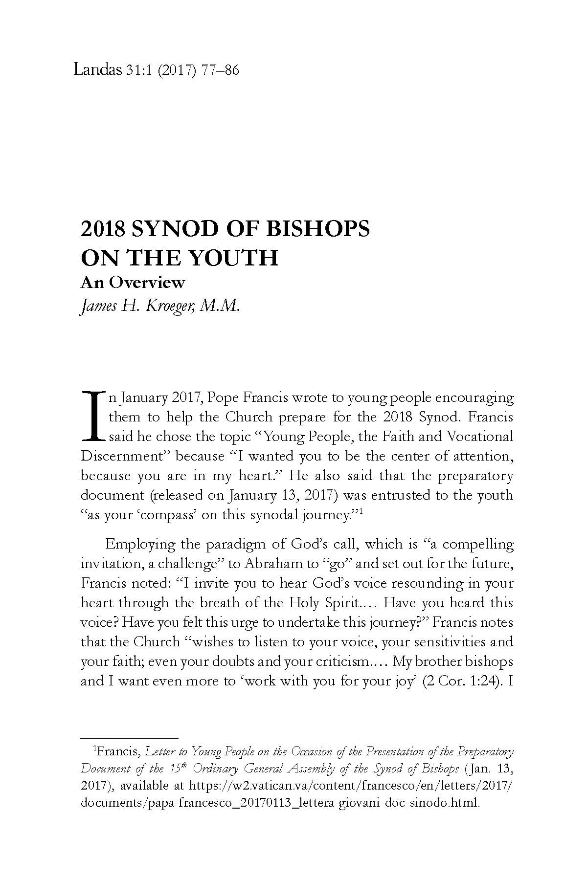 James H. Kroeger, M.M. (“2018 Synod of Bishops on the Youth: An Overview”) studies the preparatory document (Instrumentum laboris) of the 2018 Synod of Bishops on the Youth—its background, structure, and various themes presented in each section. His essay serves as a primer especially for the youth who are urged to contribute their ideas and sentiments to the Synod. In a letter he addressed to young people on the occasion of the presentation of the preparatory document, Pope Francis invites them to “go, to set out towards a future which is unknown but one which will surely lead to fulfillment, a future towards which He Himself accompanies you.…” The Pope also assures them that “the Church also wishes to listen to your voice, your sensitivities and your faith; even your doubts and your criticism. Make your voice heard, let it resonate in communities and let it be heard by your shepherds of souls.” The preparatory document which the Pope is entrusting to young people will thus be their “compass” on this synodal journey. – from the Editor’s Preface