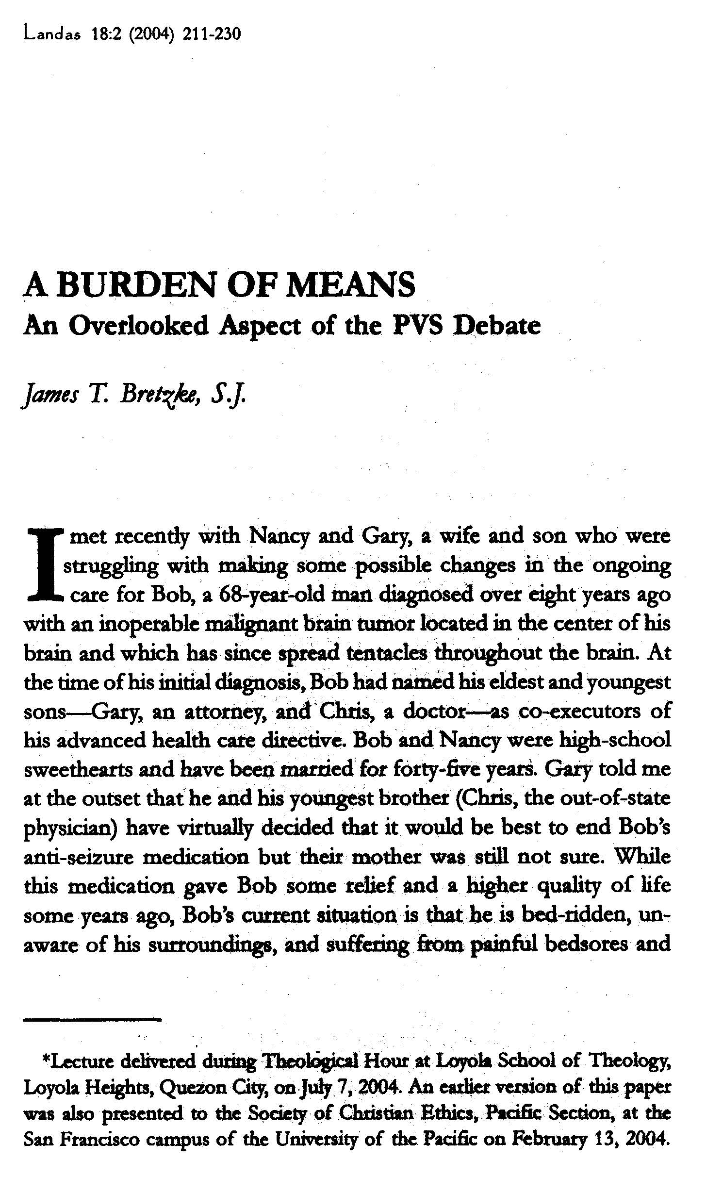 In the field of moral theology, Bretzke clarifies the broader meaning of the notion of “burden,” which is key to a proper moral valuation and application of the principle of ordinary and extraordinary means in medical care. He differentiates between a physicalist and a personalist interpretation of the principle, and explains how a difference in interpretation leads to divergent responses, one erroneous and the other appropriate. – from the Editor’s Preface