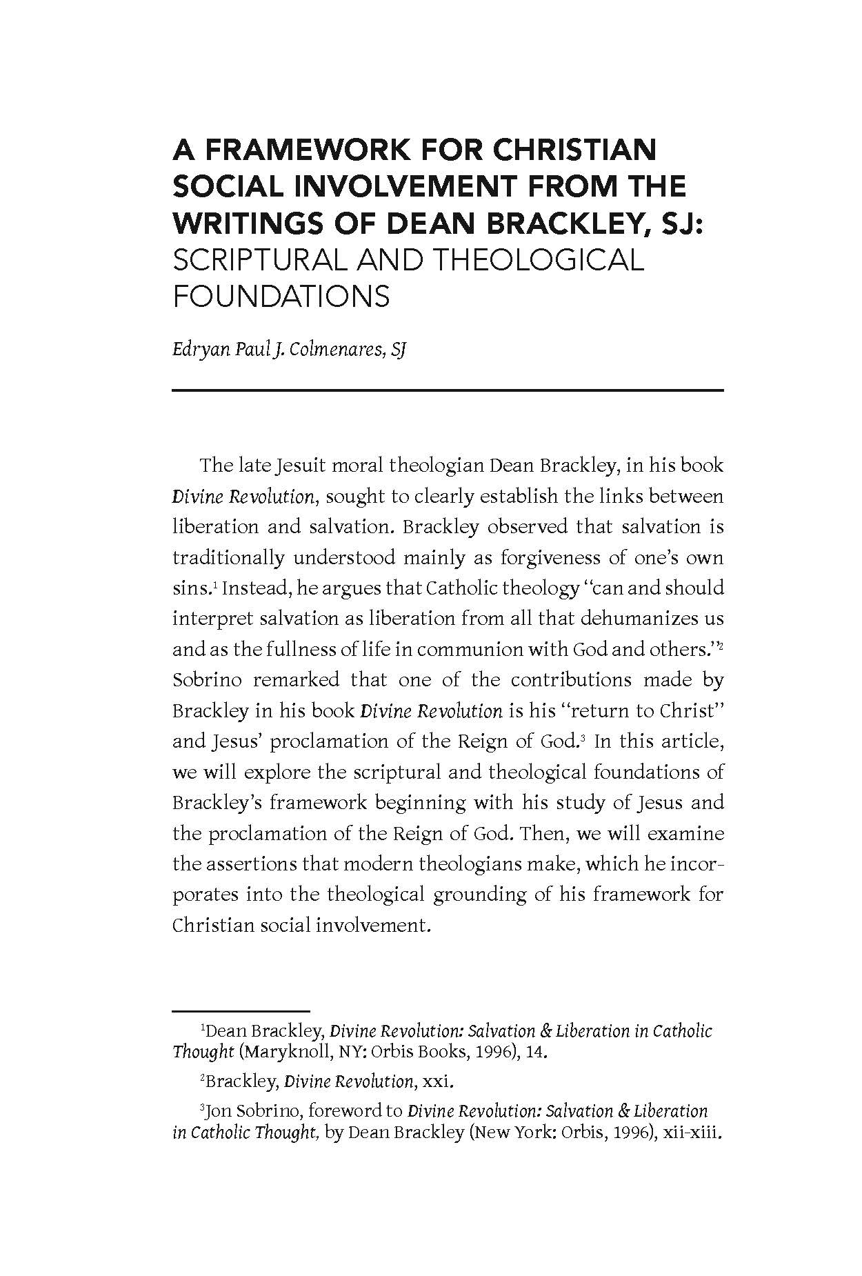 Edryan Paul J. Colmenares, SJ’s “A Framework for Christian Social Involvement from the Writings of Dean Brackley SJ: Scriptural and Theological Foundations” explores the work of the El Salvadorian Jesuit liberation theologian, Dean Brackley, and its scriptural and theological foundations. Beginning with a brilliant exposition of the theology of the Reign of God and its implications, it proceeds to compare Brackley’s thoughts with the ideas of two other great theologians, namely, Karl Rahner and Gustavo Gutierrez. It then gathers the insights of Brackley into a framework that can complement the pastoral cycle and compares this with two other frameworks: one by Jacques Maritain and the other by Juan Luis Segundo. What results is a proposal towards a more level-headed, contextually-rooted, interdisciplinary, and spiritually grounded framework for Christian social action that is hoped to be more politically effective in responding to current and future social issues in the light of faith.