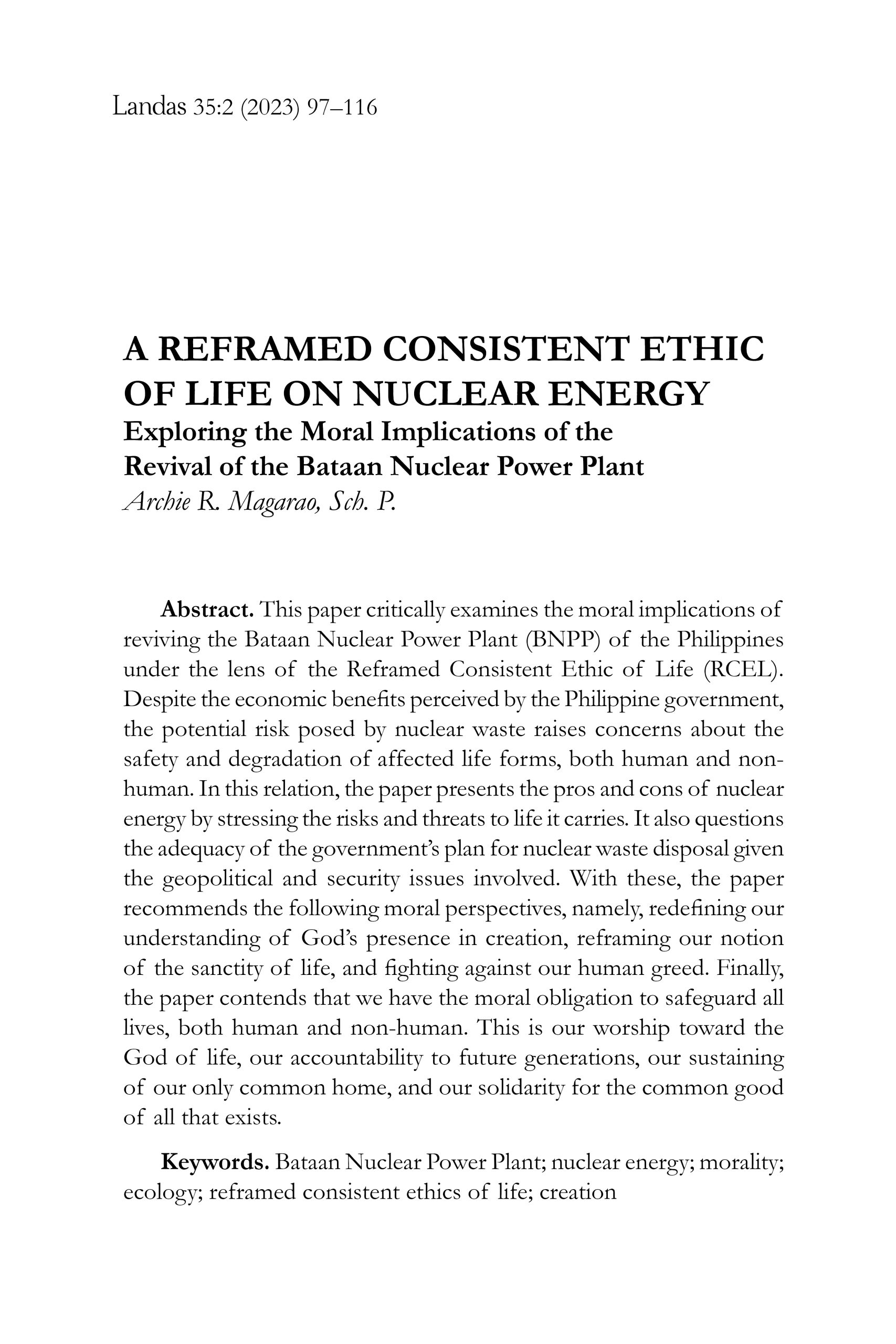 Archie R. Magarao, Sch. P., in “A Reframed Consistent Ethic of Life on Nuclear Energy: Exploring the Moral Implications of the Revival of the Bataan Nuclear Power Plant,” addresses the ethical dilemmas surrounding nuclear energy. This discussion resonates with Laudato Si’s call for careful consideration of the environmental impact of our technological and economic decisions (nos. 165–166). Magarao’s ethical exploration of nuclear energy reflects the encyclical’s emphasis on the need for a sustainable approach that respects the environment and human dignity. – Editor
