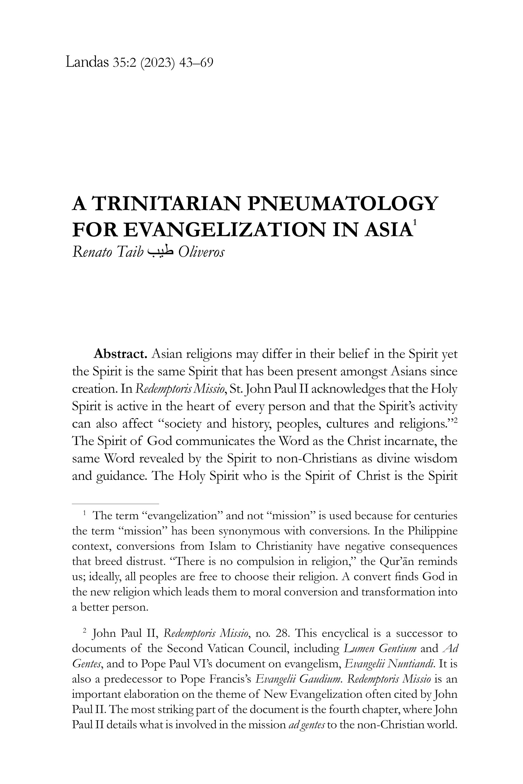 Renato Taib Oliveros’s “A Trinitarian Pneumatology for Evangelization in Asia” explores the role of the Holy Spirit in uniting people across diverse religious traditions. This concept is akin to Laudato Si’s call for an inclusive approach to ecological and social issues. Oliveros’s emphasis on the Holy Spirit’s role in creation mirrors Pope Francis’s view of the divine’s presence in all aspects of the natural world, urging a deeper respect and care for the environment rooted in spiritual values (nos. 241–242). – Editor
