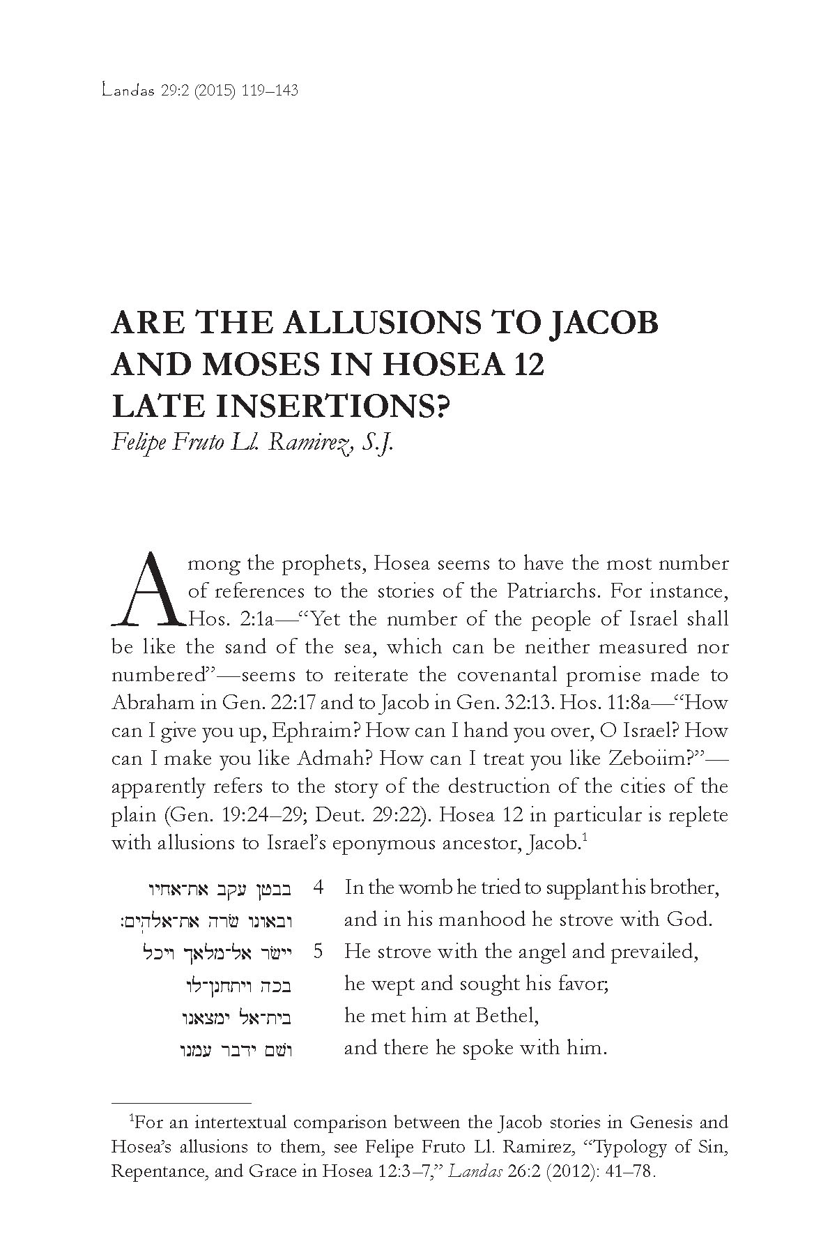 Felipe Fruto Ll. Ramirez, S.J. (“Are the Allusions to Jacob and Moses in Hosea 12 Late Insertions?”) notes that the one and only evidence we have that some of the stories of Jacob and Moses already existed in the second half of the eighth century bce is Hosea 12. Various attempts to invalidate this evidence on the basis of poetic structure, vocabulary, grammar, typology of ideas, etc. prove to be unsatisfactory. On the contrary, the use of the binomial Israel/Jacob in eighth century prophetic writings as well as the gentilics Isaac and Joseph in Amos presumes the existence of patriarchal stories that explain the connection of these names to the northern kingdom. Moreover, Hosea’s allusion to an incident in Jacob’s life not found in Genesis may attest to an early period before the fixing of the patriarchal traditions in late Judean history. Hosea’s allusions to both patriarchal and Mosaic traditions may thus give us a good indication that the epic legend of Israel’s salvation history narrated in Genesis-Exodus was already beginning to take shape during his prophetic ministry in the eighth century. – from the Editor’s Preface