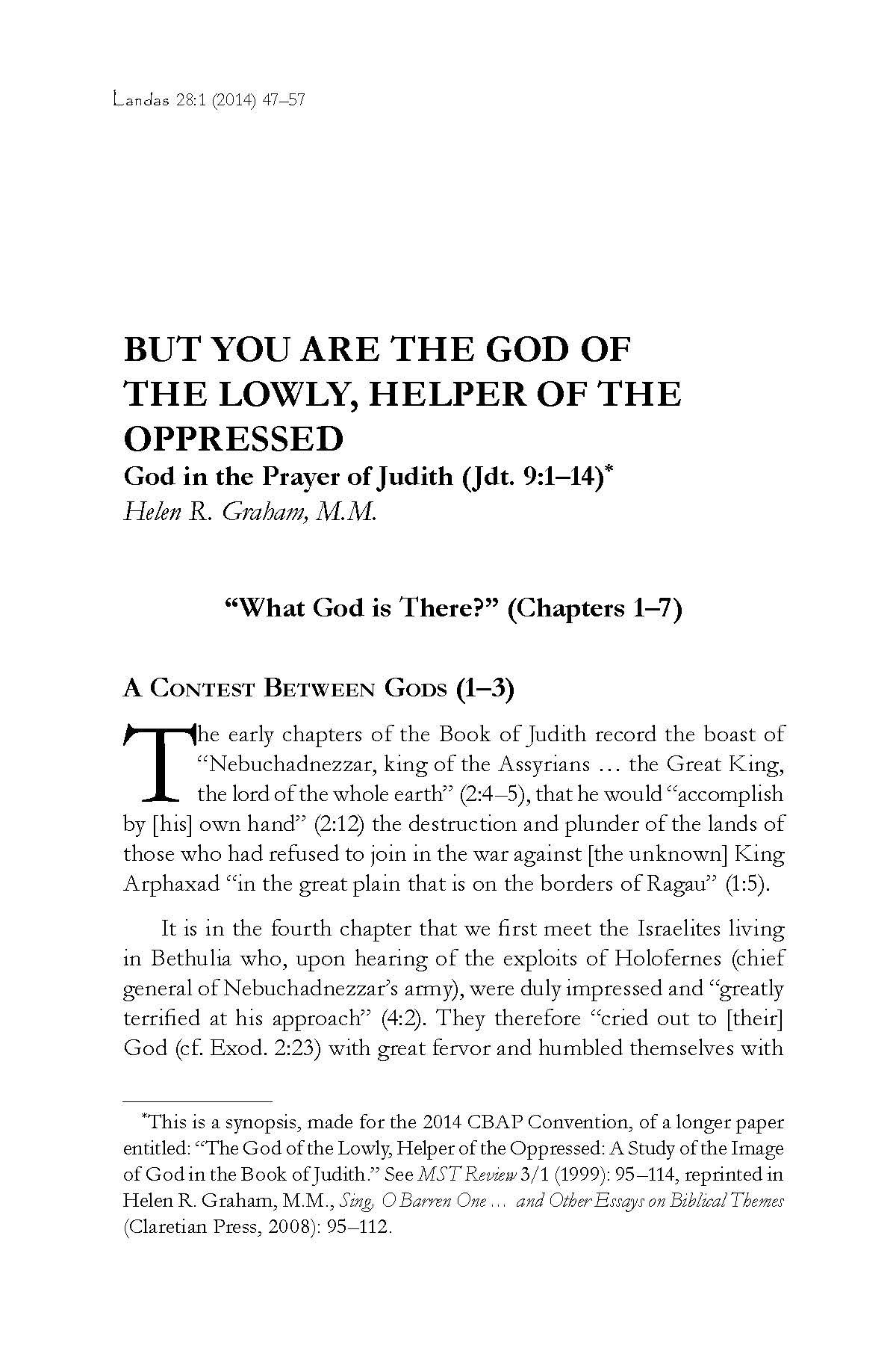 Helen R. Graham, M.M. (“But You Are the God of the Lowly, Helper of the Oppressed: God in the Prayer of Judith—Jdt. 9:1–14”) discusses how the deuterocanonical book of Judith presents God as the champion of the poor and the oppressed through the heroine’s theology and prayer. Chiding Uzziah and the people of Bethulia for giving God a deadline to save them, after which they would surrender to their enemies, Judith “speaks of the freedom of God to save or not to save.” Graham notes: “God is radically free and is not to be threatened or cajoled … Judith’s radical monotheism puts all in God’s hands … the people are only to call upon God, trust God, and wait for God’s deliverance if indeed it is God’s good pleasure to deliver.” Moreover, God tests and educates his people through suffering. Judith’s prayer contains a number of epithets—e.g., God of my ancestor, defender of widows, divine warrior, God of the lowly, king of all creation, God of all power and might—which portray in various ways the God of Israel as the one “who executes justice for the orphan and the widow” (Deut. 10:18). – from the Editor’s Preface