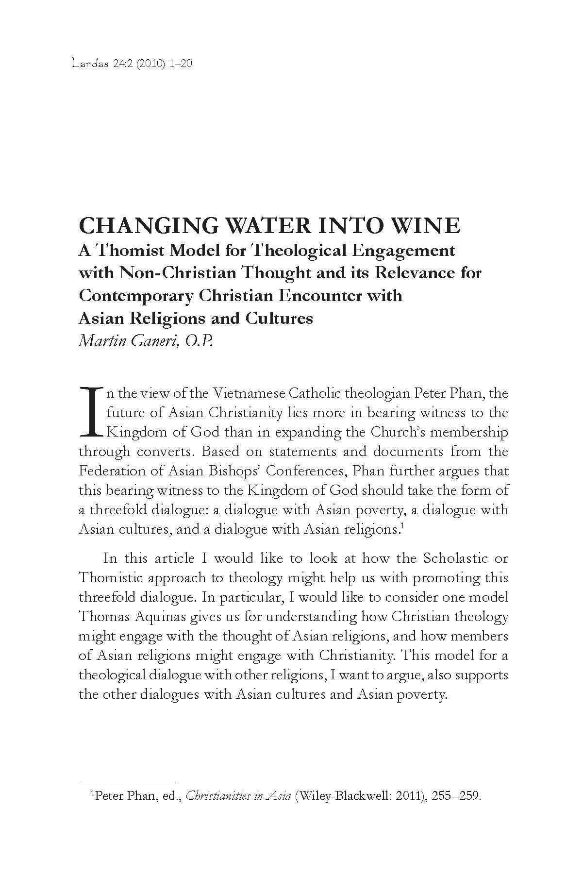 Martin Ganeri’s essay retrieves Thomistic approaches to non-Christian religions, and discovers the unexpected image of water changed into wine as a way of creative engagement between Christianity and these religions that “steer[s] between sheer opposition and sheer replacement.” – from the Editor’s Preface