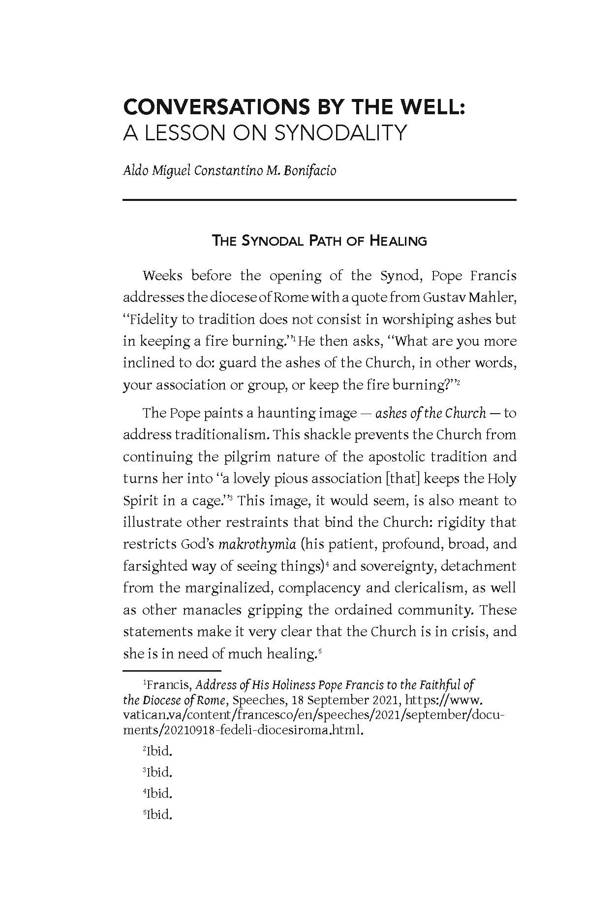 “Conversations by the Well: A Lesson on Synodality” by Aldo Miguel Constantino M. Bonifacio delves into what he calls the “healing agenda of the Synod on Synodality” and calls our attention to how the ongoing synodal process is actually promoting no less than a paradigm shift within the Church. Anchoring his reflection on the Johannine story of the Samaritan Woman who encountered Jesus by the well, he draws lessons on how the Church today can come to terms with her own sinfulness and “unbelonging” so as to receive the healing she needs to become her true synodal self. At the same time, there is a parallel invitation to imitate Jesus in dealing with “others” with a welcoming attitude that allays fear, encourages self-disclosure, and opens the way to encounter and dialogue.