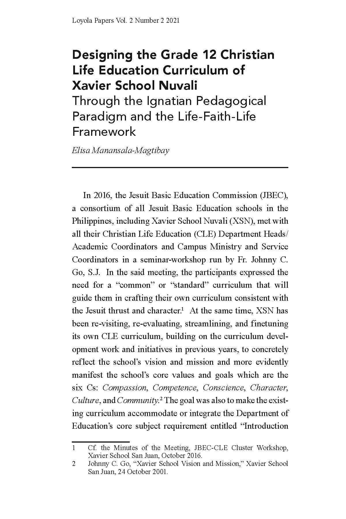 The third article by Elisa Manansala-Magtibay, titled, “Designing the Grade 12 Christian Life Education Curriculum of Xavier School Nuvali Through the Ignatian Pedagogical Paradigm and the Life-Faith-Life Framework” chronicles the efforts of a relatively-new, Jesuit-run K-12 school located in an emerging urban center a few miles south of Metro Manila as it strives to integrate Ignatian principles in its religious instruction curriculum. Aside from providing a valuable glimpse into the design process that went into their program, this article also contains a number of seminal ideas that can be explored and developed further by those involved in the education ministry. Among these is the potential of using more widely-known and current teaching and learning models such as Understanding by Design and Groome’s Shared Christian Praxis model as concrete ways to apply the Ignatian Pedagogical Paradigm towards creating opportunities for students to encounter Christ. – from the Editor’s Preface