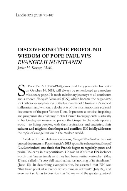 James H. Kroeger, M.M. (“Discovering the Profound Wisdom of Pope Paul VI’s Evangelii Nuntiandi”) revisits and reexamines Pope St. Paul VI’s apostolic exhortation Evangelii Nuntiandi (Evangelization in the Modern World) in celebration of the latter’s canonization on October 14, 2018. Published in the wake of the 1974 International Synod on Evangelization, the exhortation contains profound insights that are the results of both the Synod discussions and the extensive consultations undertaken to prepare for it. The document as such has contributed to a holistic and integral understanding of evangelization, and delineates the theological principles and guidelines which all Christians should follow when evangelizing and giving credible witness to the Gospel. Kroeger notes that Paul VI, who also placed evangelization at the heart of the Church’s contemporary mission, “carefully defines, nuances, and balances diverse elements within the evangelization process.… It is his unique genius to have achieved integration and balance on so many topics” (95). As a result, both Pope St. John Paul II (Redemptoris Missio) and Pope Francis (Evangelii Gaudium) have taken up the challenge of redirecting the Church’s mission toward evangelization. Francis’s reform agenda, for instance, envisions the creation of a new “super dicastery for evangelization” which is expected to surpass the Congregation of the Faith in terms of importance. Evangelii Nuntiandi can thus be called the magna carta of the Catholic Church’s mission of evangelization, and rightly so. – from the Editor’s Preface