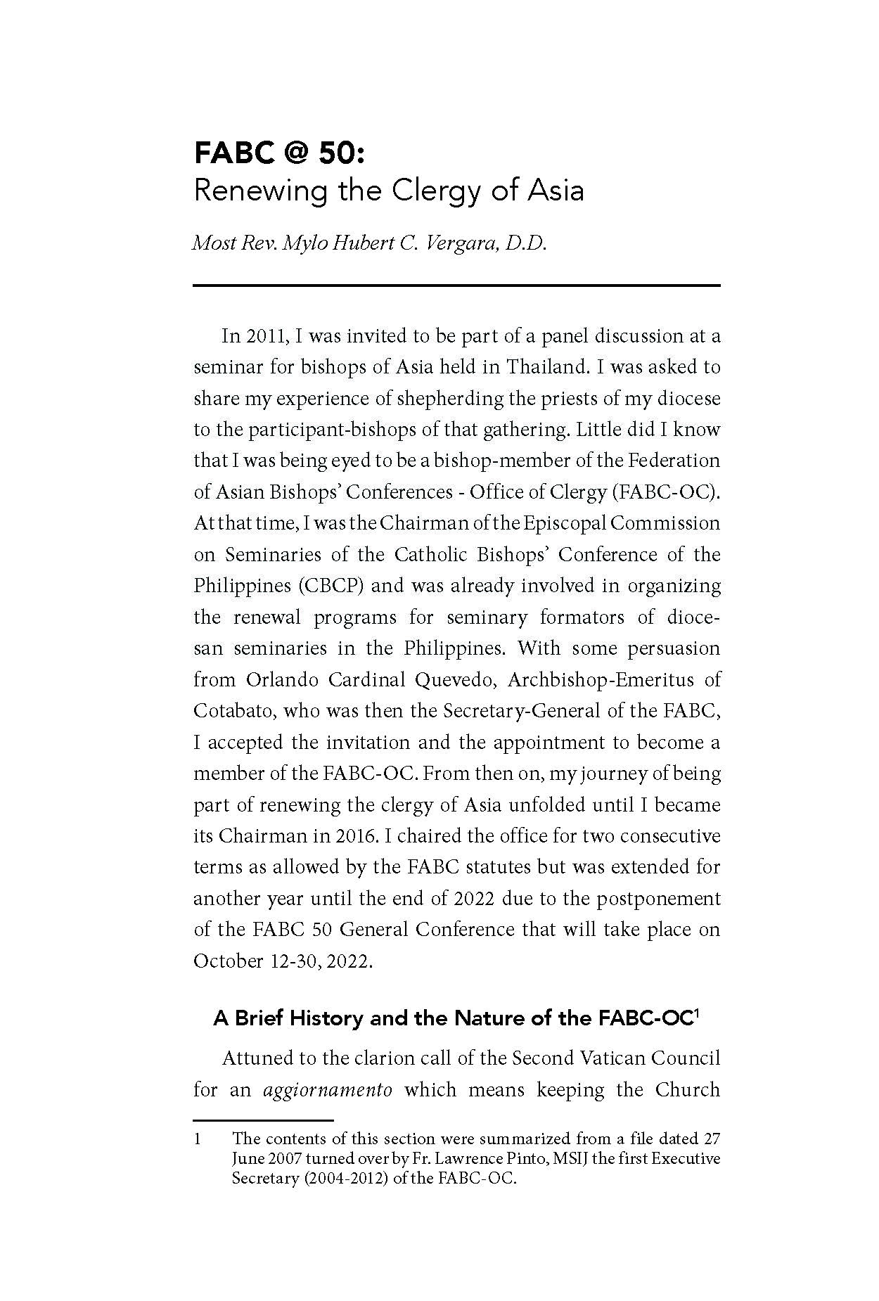 In “FABC@50: Renewing the Clergy of Asia,” Most Rev. Mylo Hubert C. Vergara who is head of the FABC’s Office of Clergy (FABC-OC) shares his experiences of working with and for the FABC in this important area, giving us a picture of how an FABC office operates. The seminars organized and papers produced, as he says, “reveal how the FABC-OC has been true to its mission to renew and empower clergy in the Asian context to deal with the contemporary challenges in their priestly life and ministry.” He also identifies a number of vital prospects that the FABC-OC is currently aiming at towards the renewal of clergy in Asia as well as to respond to pressing issues such as the clergy abuse crisis. – from the Editor’s Preface