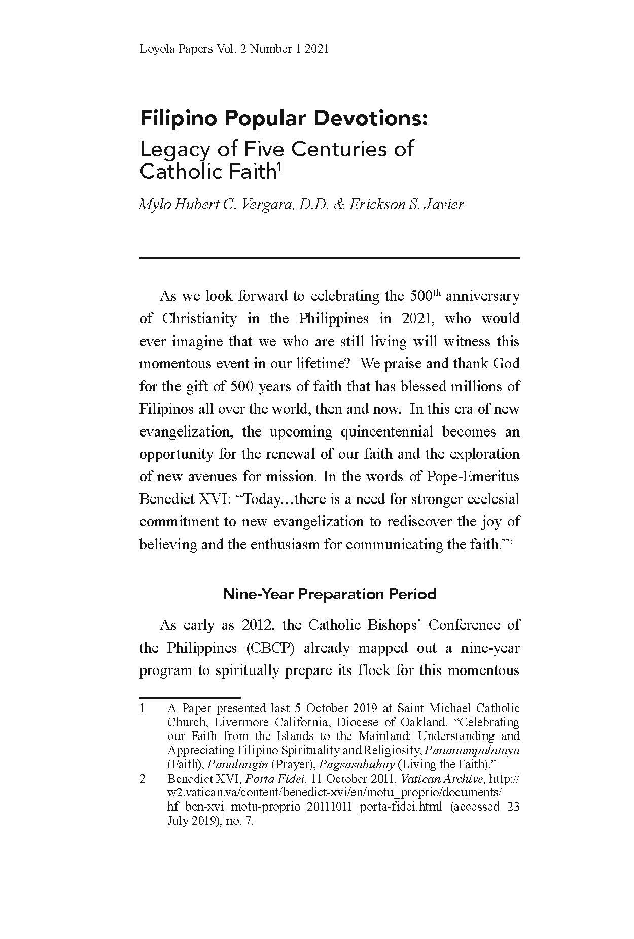 In “Filipino Popular Devotions: Legacy of Five Centuries of Catholic Faith,” Bishop Mylo Hubert Vergara, D.D. and Erickson S. Javier explore the very interesting field of popular devotions, whose great potential remains to be mined by theologians and pastors alike. The Filipino people being “intrinsically religious,” they observe, these expressions of piety and religiosity not only serve as visible manifestations of our people’s faith but can also become “potent instruments for the New Evangelization,” especially as Filipinos bring these devotions with them in the global diaspora. At the same time, the authors point out areas for growth where these customs and traditions can still improve to become more “mission-oriented” and “socially conscious” as “an integral part of a holistic and dynamic Christian faith.” – from the Associate Editor’s Preface