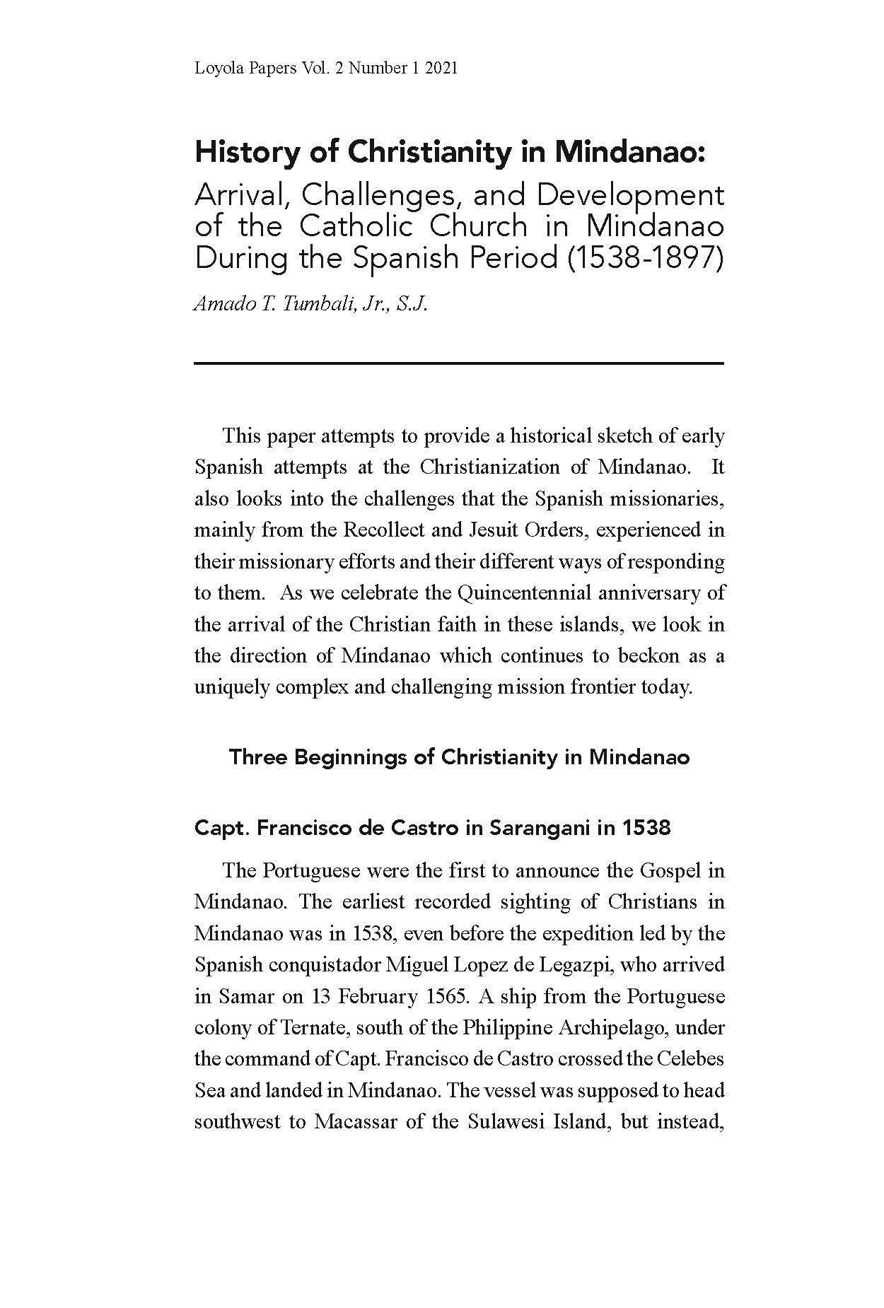 Amado T. Tumbali, Jr., S.J.’s “History of Christianity in Mindanao: Arrival, Challenges, and Development of the Catholic Church in Mindanao During the Spanish Period (1538-1897)” takes us back in time to early attempts to Christianize the island made by Jesuit and Recollect mission- aries. In this brief and fast-paced narrative, he gives us a glimpse of the different challenges faced by the missionaries as well as the various ways by which they tried to respond, including not so “religious” strategies such as building forts and diplomacy. Indeed, a timely revisit at the history of Christianity in the Philippines would be sorely incomplete if it were to focus only on landmark events and forget the unsung efforts of the countless ministers of the Gospel who labored tirelessly and creatively on the ground – some even giving up their life – to sow the Faith in these islands. – from the Associate Editor’s Preface