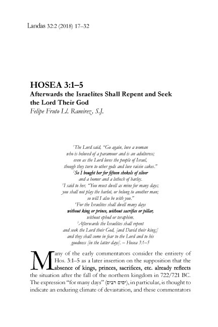Felipe Fruto Ll. Ramirez, S.J. (“Hosea 3:1–5: Afterwards the Israelites Shall Repent and Seek the Lord Their God”) presents an exegetical essay on Hos. 3:1–5 in which he finds three elements that are inextricably linked with one another and which are essential for communicating the integral message of the prophet: allegory, interpretation, and outcome. Narrated as a first-person account, Hosea’s life story is an allegory meant to convey a prophetic message to Israel. All his actions have symbolic meanings which are explained in the storytelling process and interpreted in terms of their significance and import for the nation. The interpretation comes in the form of a comparison—how God will deal with his people—while the outcome spells out what is in store for Israel’s future; punishment (v. 4) along with its healing effect (v. 5) are thus foretold. “The divine strategy of loving Israel despite her infidelity and of divesting the nation of its government and cult for many days triumphs and elicits repentance from the people: “afterwards the Israelites will repent and seek the Lord their God” (20). – From the Editor’s Preface