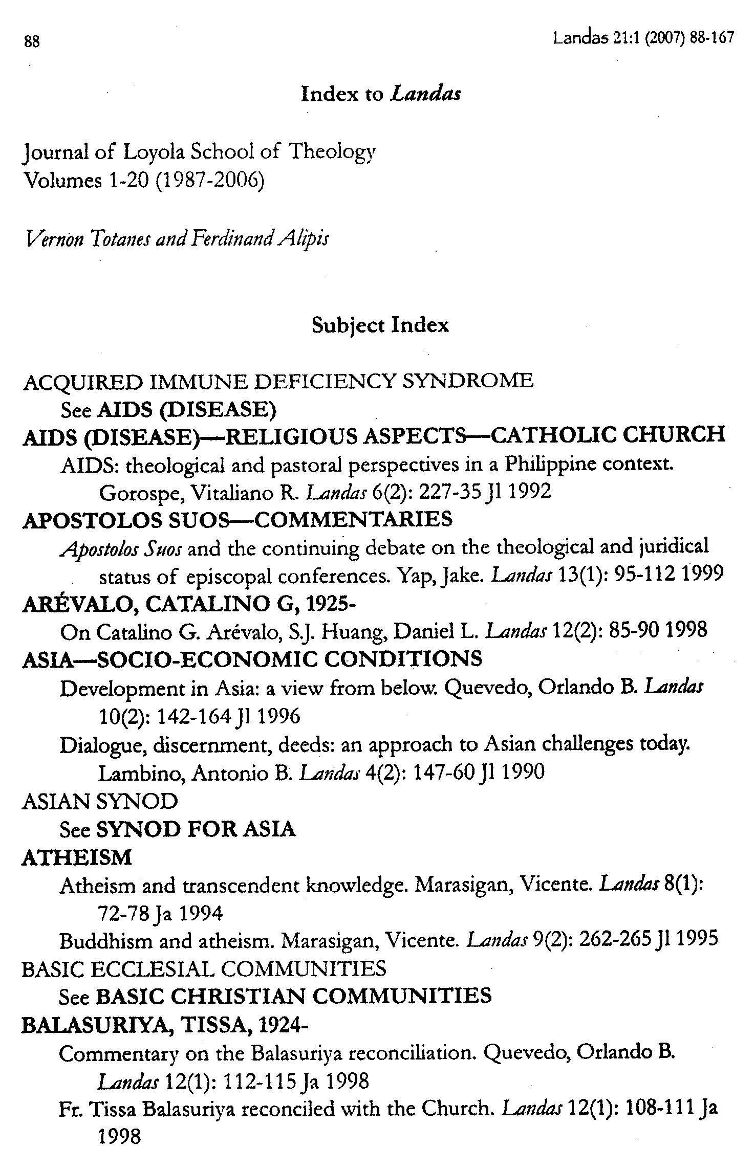 Landas completed twenty years of continuous publication in 2006 and offers in this issue a comprehensive index compiled by Vernon Totanes and Ferdinand Alipis. It is hoped that this will facilitate access for all those doing research. Mr. Totanes [at the time was] pursuing a PhD at the University of Toronto’s Faculty of Information while Mr. Alipis [was the] Director of Ralph Gehring Library, Loyola School of Theology. – from the Editor’s Preface