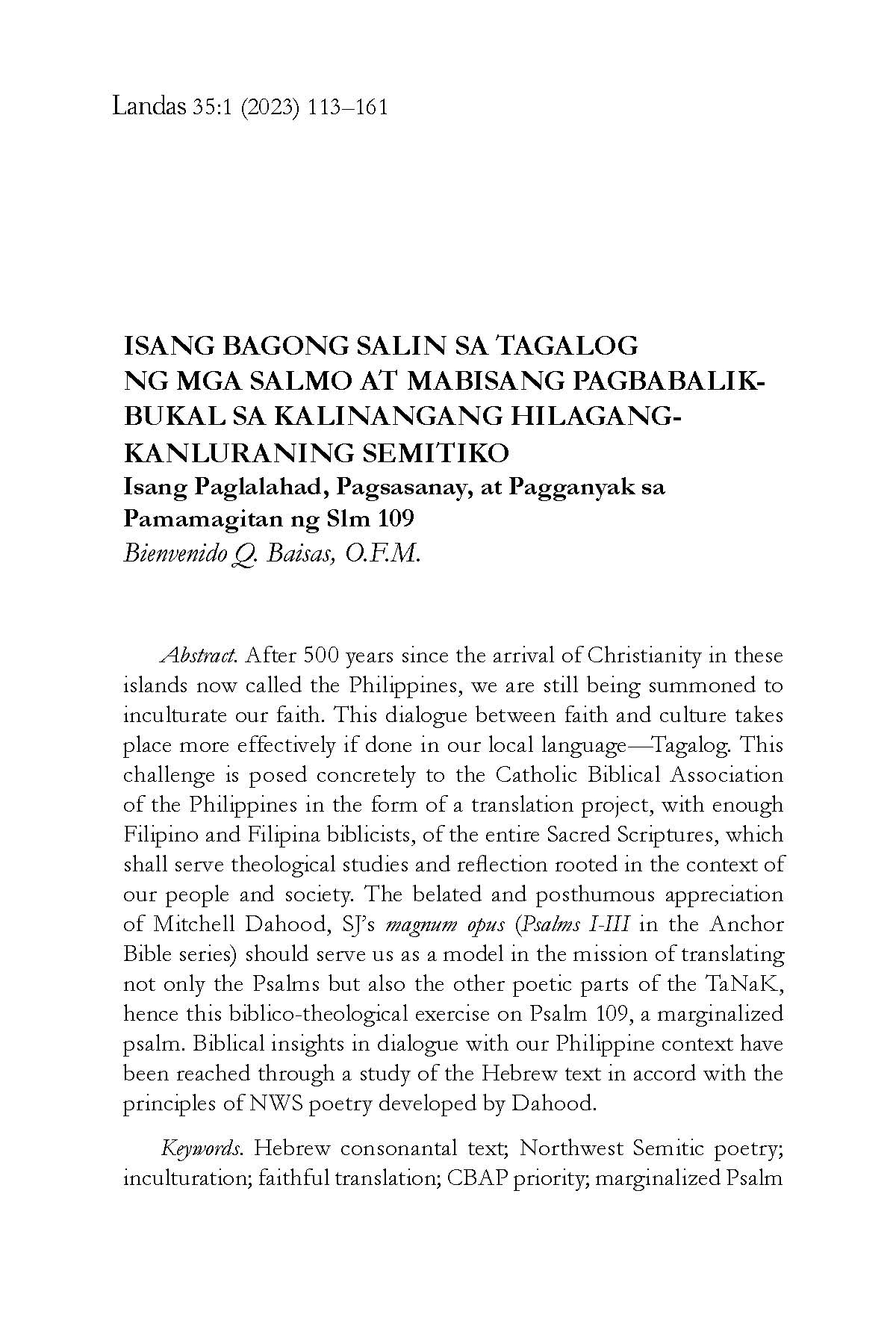 Bienvenido Q. Baisas, O.F.M. poses a challenge to the Catholic Biblical Association of the Philippines to inculturate our Filipino faith in our local language—Tagalog. The author contends that Mitchell Dahood, S.J.’s magnum opus (Psalms I-III in the Anchor Bible series) “should serve us as a model in the mission of translating not only the Psalms but also the other poetic parts of the TaNaK” (113). Baisas exemplifies such an endeavor in the translation of Psalm 109 based on the Hebrew text “in accord with the principles of NWS poetry developed by Dahood” (113).