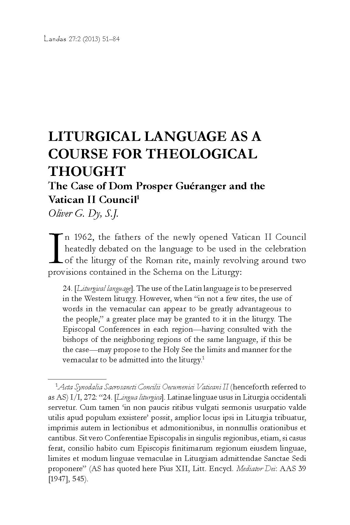 The FABC’s call for dialogue with various cultures of Asia has also given impetus to the use of the vernacular in the liturgy of the local churches. Oliver Dy revisits the debate in the Second Vatican Council and argues that the council’s decision in Sacrosanctum Concilium—to allow a wider use of the vernacular in the Roman rites—constitutes a shift away from the position of Dom Prosper Guéranger (1805–1875), whose theology contributed to the “essentialization” of Latin as the language proper to the celebration of the Mass. Dy attributes this shift to the change in the historical contexts in which Guéranger and the Vatican II Council (1962–1965) operated: