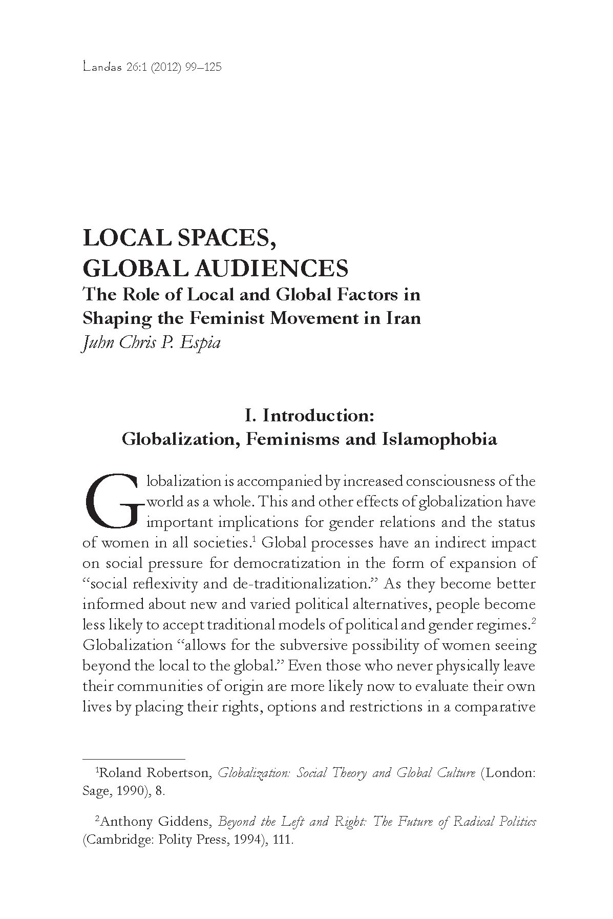 Juhn Chris Espia’s essay on women engages a different religious tradition, Islam, and another cultural context, Iran. It does not only describe how the status of women is linked to religion but also how other global and local forces shape this religion-gender nexus. – from the Editor’s Preface
