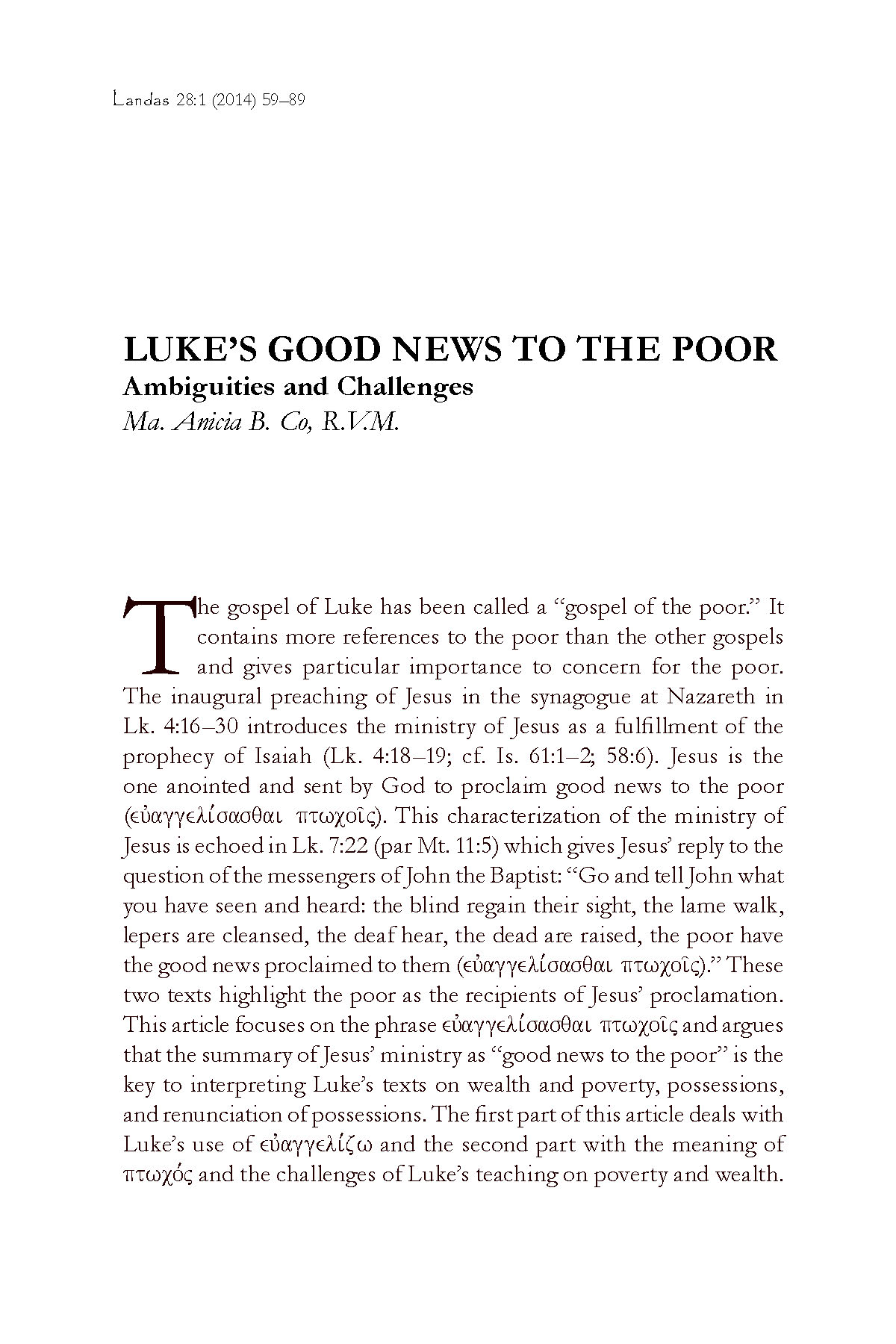 Ma. Anicia B. Co, R.V.M. (“Luke’s Good News to the Poor: Ambiguities and Challenges”) explains the significance of the programmatic passage found at the beginning of Jesus’ public ministry in Luke’s gospel: “The Spirit of the Lord is upon me, because he has anointed me to bring good news to the poor ….” (Lk. 4:18–19; cf. Isa. 61:1–2; 58:6). Co investigates first the meaning of the verb [to bring good news] and then the identity of the [poor]. What did Jesus do to bring good news? Co studies all the various occurrences of [the verb] in Luke-Acts. “Bringing good news” is a fitting prelude to all of Jesus’ subsequent activities: e.g., proclaiming the Kingdom of God, healing the sick, raising the dead, reconciling sinners to God, etc. The “good news” is Jesus himself and the authority manifest in his person. Who are the “poor” that are the recipients of good news? They are not just the needy and the afflicted, but also the sinners whom Jesus cared for and reconciled with God. Moreover, there are also those who have made themselves poor in order to follow Jesus. “What Jesus started in his ministry,” Co notes, “is an alternative lifestyle of radical prophetic poverty. It is an alternative lifestyle that manifests radical trust in God, serves as a protest against rich living, and expresses solidarity with the least.” This is the kind of poverty that challenges all of us who aspire to be disciples of Jesus. – from the Editor’s Preface