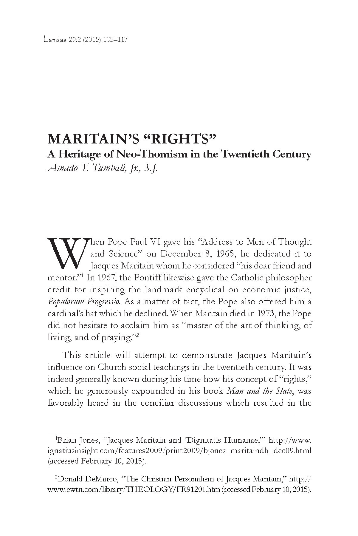 Amado T. Tumbali, Jr., S.J. (“Maritain’s ‘Rights’: A Heritage of Neo-Thomism in the Twentieth Century”) explains Maritain’s contribution to the development of the United Nation’s Universal Declaration of Human Rights. Using the philosophy of St. Thomas Aquinas and the neo-scholastics, he staunchly defended a natural law ethics. He regarded moral norms as intrinsically bound to human nature. Unlike other philosophers who regarded human rights as the product of a sociological form of rule setting, or a reasoned agreement of people to accept norms imposed by a legitimate authority in exchange for security and economic benefit (cf. John Rawls’ Law of Peoples), Maritain traced the underlying basis of the concept of human rights to natural law, particularly to human nature. For Maritain, these rights are known primarily through what he calls connaturality or congeniality which develops in human persons as they grow in moral experience and maturity. Maritain’s way of philosophizing on human rights has thus laid a more stable foundation for the universal and immutable character of these rights. – from the Editor’s Preface