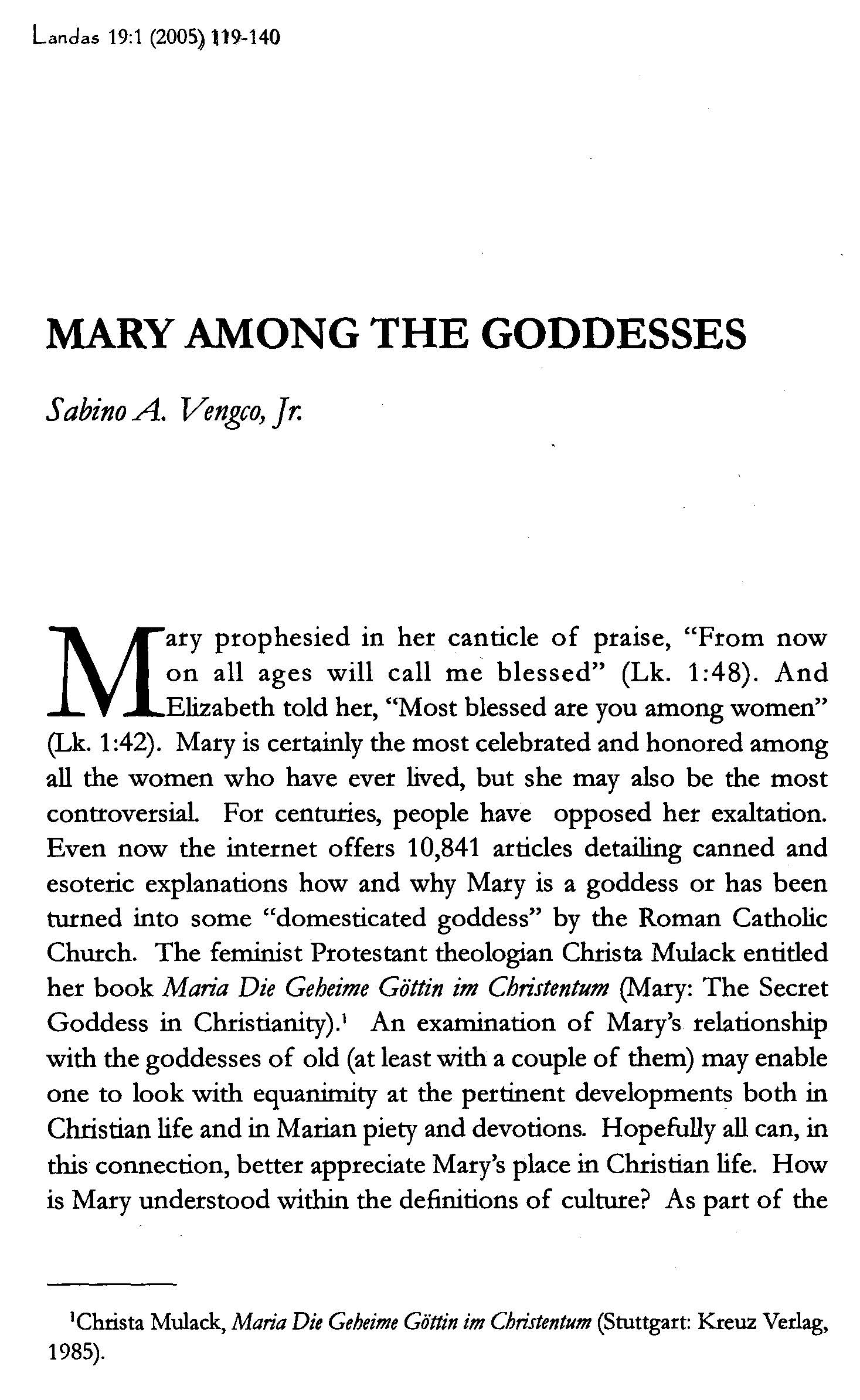 Diocesan priest and mariologist Sabino Vengco brings readers to three continents and demonstrates bow Mary in each place and time identifies with the local people in their unique situation and religiosity. – from the Editor’s Preface