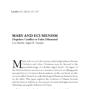 Mary’s role vis-à-vis the tenuous relationship between Roman Catholics and other Christians may be likened to the proverbial image of a double-edged sword—the figure of the Mother of Jesus can serve as a common reference or rallying point among believers of various denominations, on the one hand, yet also act as an added obstacle to understanding and harmony between them, on the other. This paper explores the evolution of Marian doctrine and devotion in relation to the pursuit of ecumenical agreement and fellowship among the followers of Christ. – Author (first paragraph)