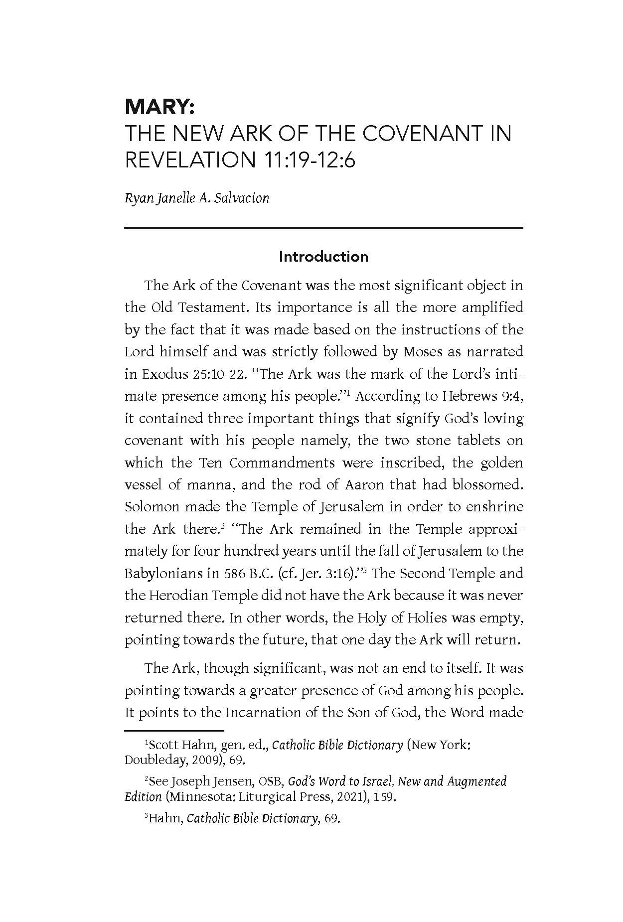 We have Ryan Janelle A. Salvacion’s “Mary: The New Ark of the Covenant in Revelation 11:19-12:6,” an exegetical commentary on the famous passage that has sometimes been applied in the Catholic tradition to the Blessed Virgin Mary but has also been interpreted by some scholars as an allusion to the Church. After comparing various interpretations of the text, the paper also turns to other biblical accounts as well as extra-biblical catechetical and theological resources, including the Church Fathers, the Catechism of the Catholic Church, Pope Benedict XVI, and Bishop Robert Barron in support of the Marian interpretation.