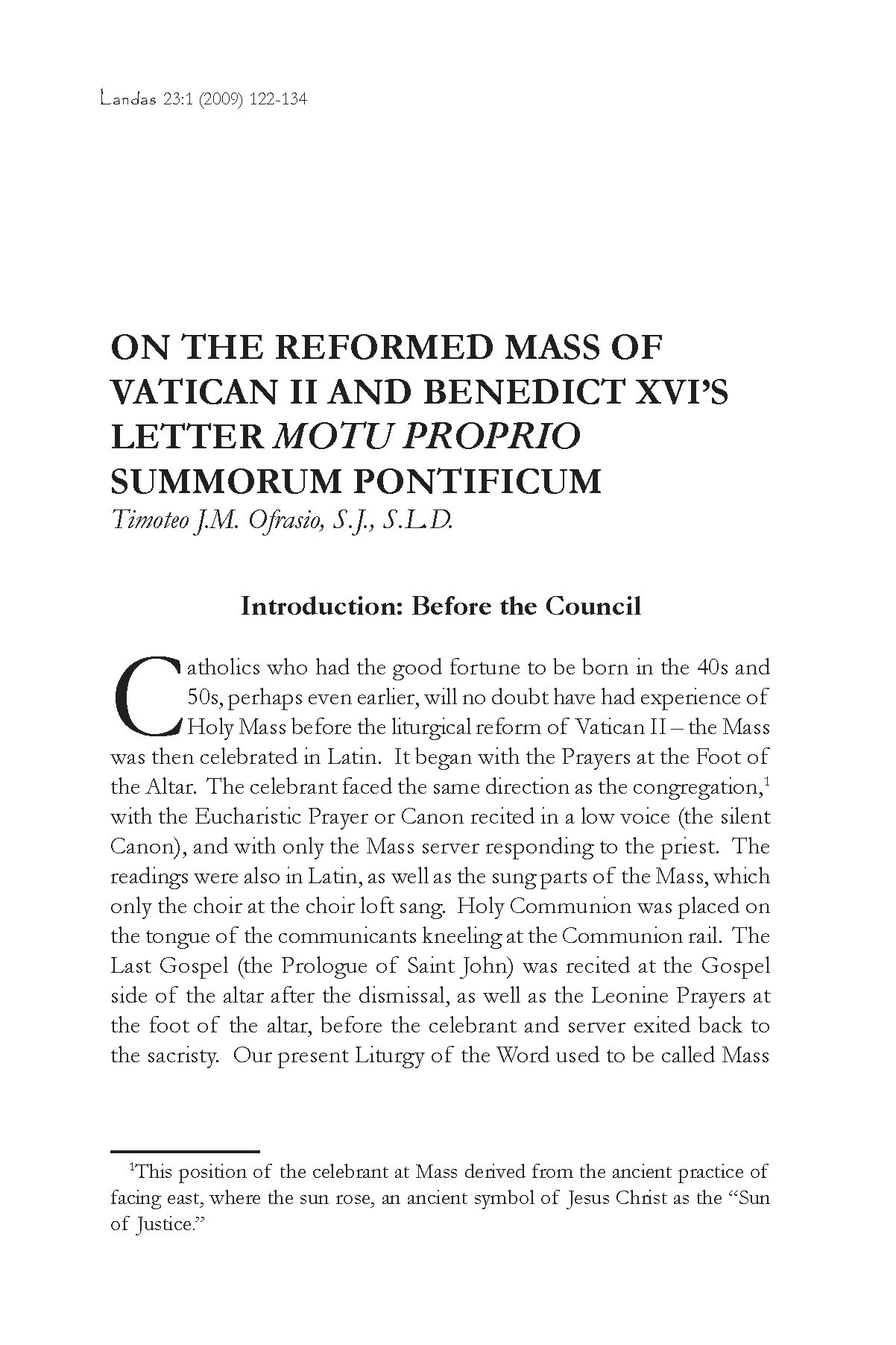 Liturgy. Timoteo Ofrasio, S.J., in “On the Reformed Mass of Vatican II and Benedict XVI’s Letter motu proprio Summorum Pontificum,” succinctly traces the recent history of the Catholic Mass, moving from the “Reformed Mass of Vatican II” as mandated by Sacrosanctum Concilium to the Mass of Paul VI to Benedict XVI’s Summorum Pontificum. He strongly recommends that a program of catechesis be designed to help Catholics understand the liturgy and the values that inform the celebration of the mass. He does this with an obvious appreciation for the Tridentine liturgy, but he is also cognizant of the many “good reasons” that ensure a secure future for the reformed mass of the last Council. Perhaps what is required is an informed study and sustained conversation on the place of liturgy itself in Christian life. – from the Editor’s Preface