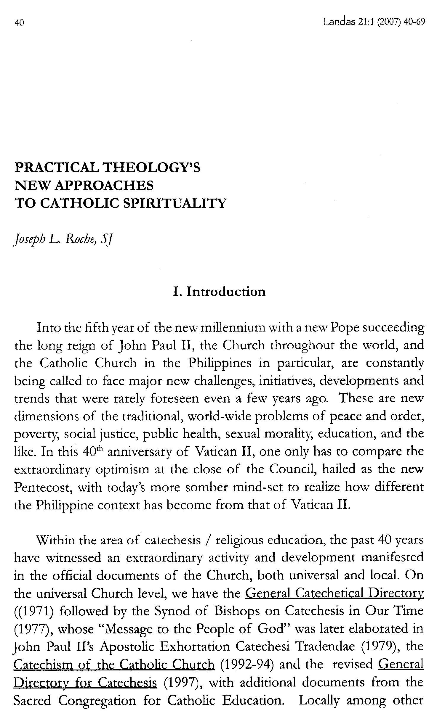 This essay by Joseph L. Roche, S.J. comments on some new approaches to Catholic spirituality from the perspective of religious education. Consistently aware of the importance of catechesis and deeply committed to “authentic Filipino Catholic believing in Christ,” Roche demonstrates how the theological discipline of practical theology is helpful in bridging the gap between theory and practice in religious education. – from the Editor’s Preface