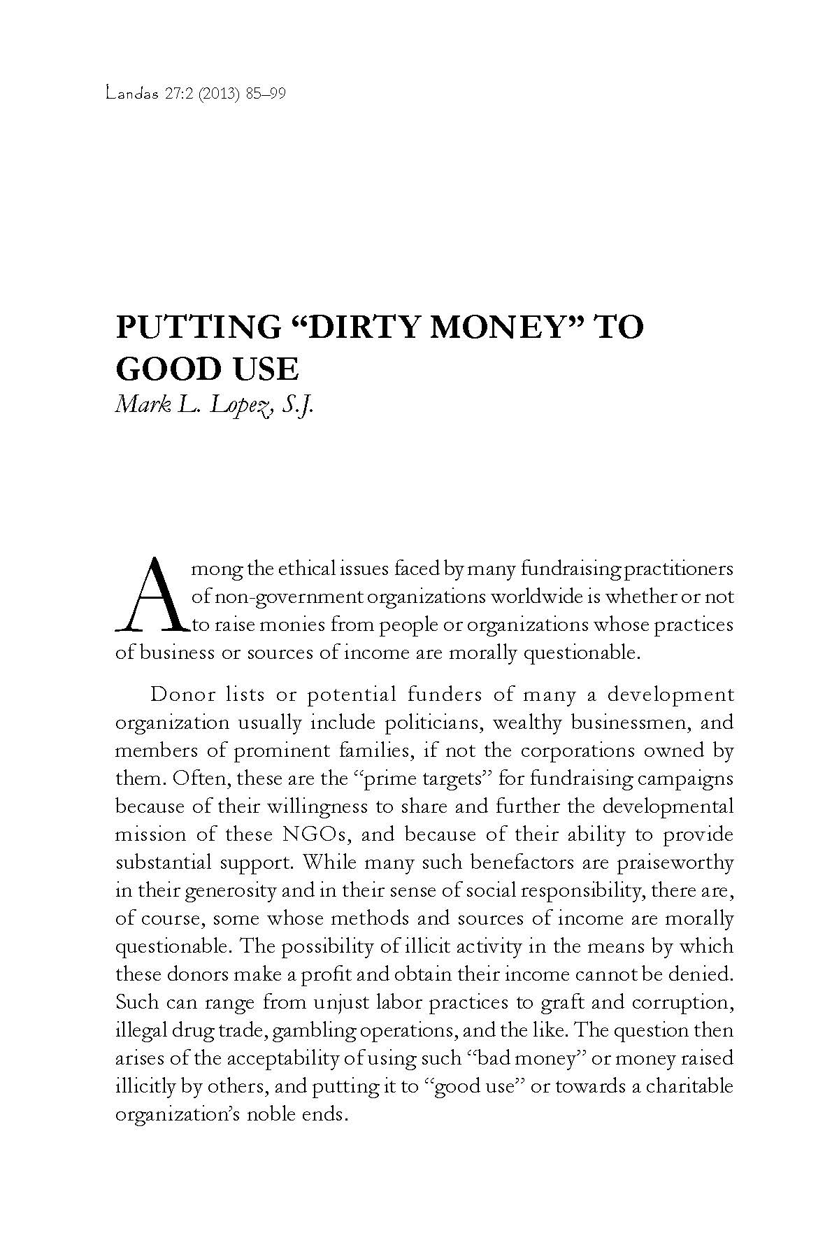 Mark Lopez tackles the issue, often faced by NGOs and charitable institutions, of whether or not to accept funds from donors whose business practices or sources of income are morally dubious. In order to concretize the moral problem, he presents a hypothetical case of Bishop W, the apostolic vicar of an under-resourced Vicariate in Southern Mindanao that provides microcredit to indigent communities. Should the bishop accept a donation from XYZ Corporation, a company that is notorious for unjust labor practices and is involved in several land disputes with indigenous peoples in other parts of Northern Mindanao? Lopez uses three moral frames to weigh the issue: 1) cooperation with evil, 2) the appropriation of evil, and 3) the consideration of scandal. The first and third are traditional principles of morality. The second is a more recent principle proposed by Cathleen Kaveny (“Appropriation of Evil: Cooperation’s Mirror Image,” Theological Studies, 2000). In line with virtue ethics, this moral frame highlights how evil acts cause harm not only to the victim but also to the agent. At the end of the case study, Lopez concludes that