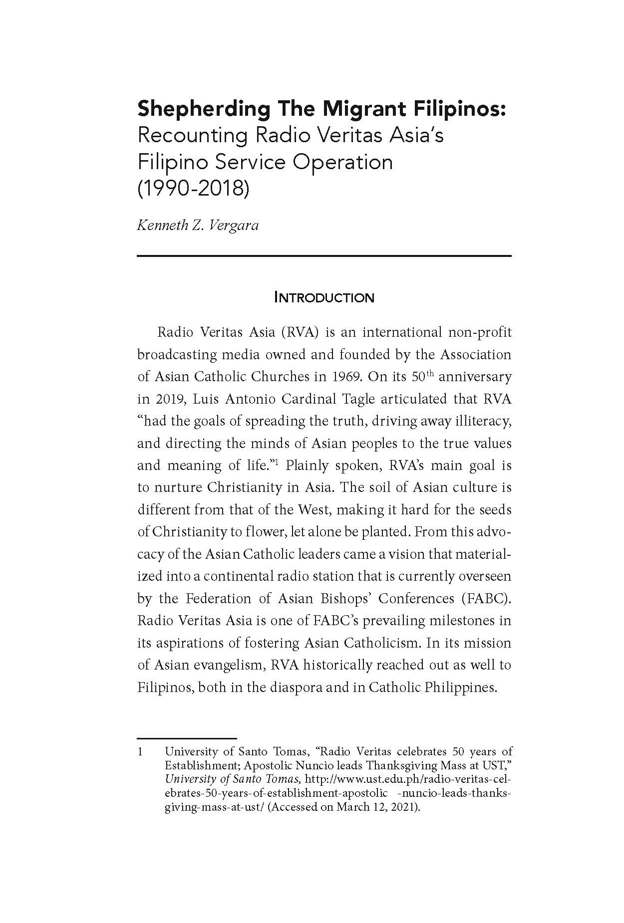 Kenneth Z. Vergara’s “Shepherding the Migrant Filipinos: Recounting Radio Veritas Asia’s Filipino Service Operation (1990-2018)” provides a glimpse into the vital ministry of social communication, which has been a key pastoral prior- ity for the FABC. Indeed, the station itself actually precedes the establishment of the FABC by only more than a year, while sharing the same objective of bringing the Gospel to the peoples of Asia. Focusing in particular on the station’s outreach to Filipino migrants that was initiated in 1990, this paper chronicles some of the achievements of the Filipino service operation that embody the missionary commitment of the people behind this important apostolate, which, albeit already discontinued, continues to provide a helpful model for us today. – from the Editor’s Preface