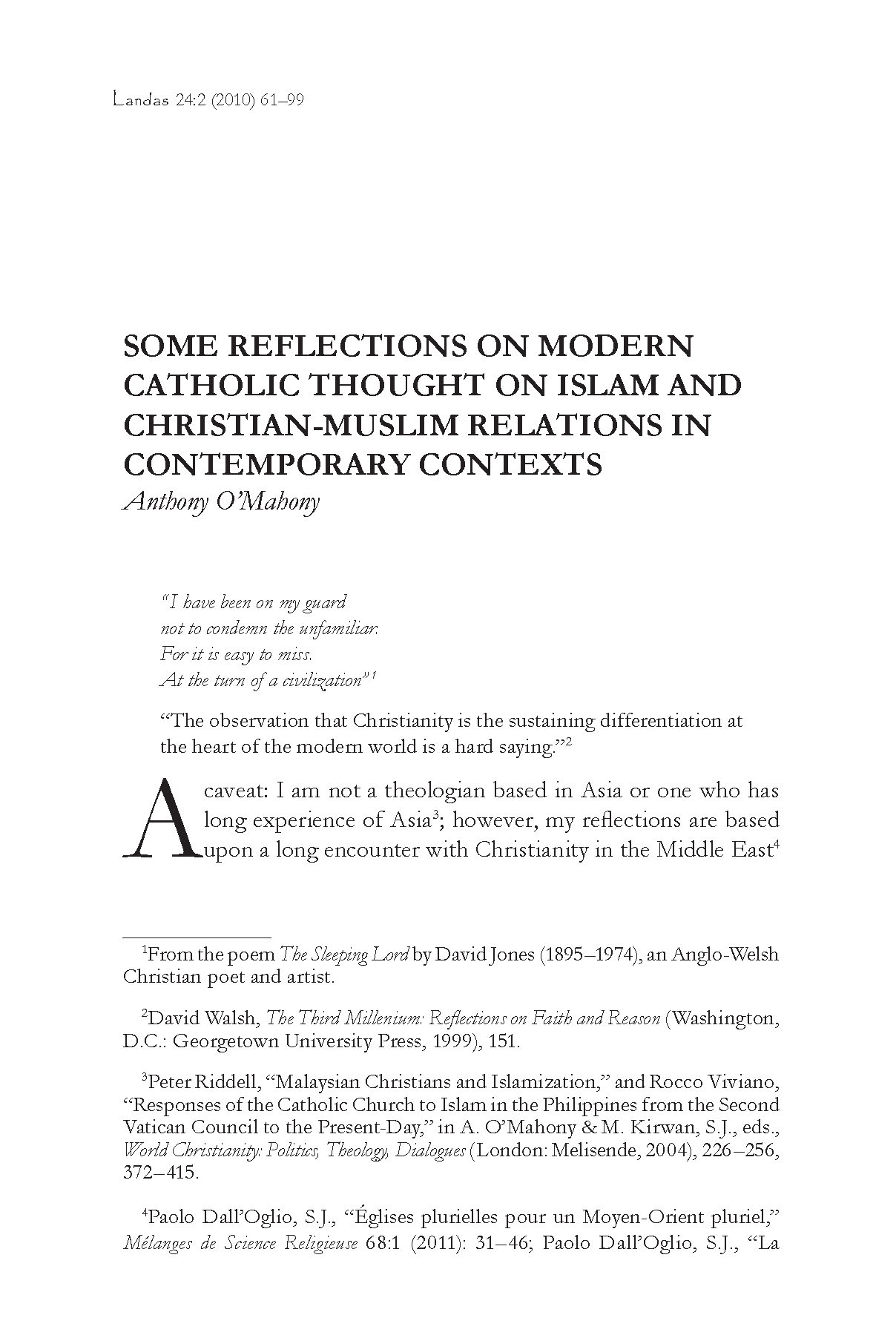 O’Mahony’s essay discusses important aspects of the evolution of Catholic thought on Islam from the Second Vatican Council onwards, and locates them in the changing global religious and political context today. – from the Editor’s Preface
