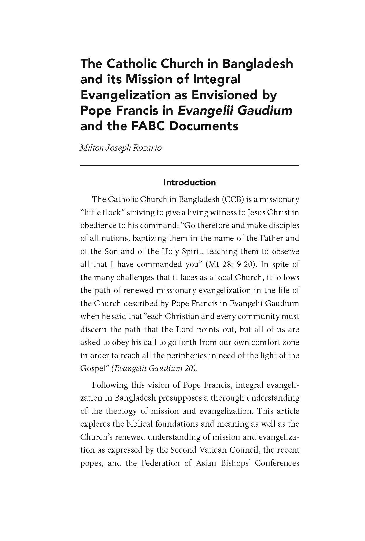 Fr. Milton Joseph Rozario’s “The Catholic Church in Bangladesh and Its Mission of Integral Evangelization as Envisioned by Pope Francis in Evangelii Gaudium and the FABC Documents” contextualizes the theology of mission as found in the Scriptures, in Vatican II, in the teachings of recent popes and the documents of FABC in the present situation of the local Church in Bangladesh, with its unique features and challenges. In this bold and thought-provoking article, he acknowledges how some of our churches may still be operating based on outdated notions and models of mission which may not be appropriate anymore and as such are ineffective in our particular contexts today here in Asia with its plurality of cultures, religions and social conditions. Hence, the call to renewal as expressed especially in Evangelii Gaudium and the FABC documents. – from the Editor’s Preface