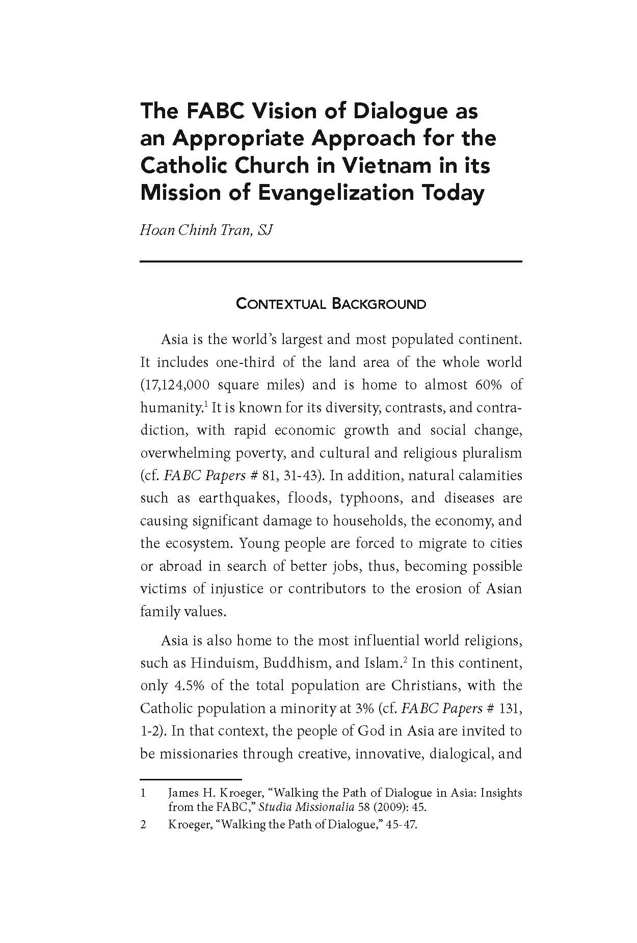 Fr. Hoan Chinh Tran SJ’s “The FABC Vision of Dialogue as an Appropriate Approach for the Catholic Church in Vietnam in Its Mission of Evangelization Today” sees the path of dialogue as a way to bridge the gap between the Catholic Church and the State in Vietnam created by centuries of colo- nization and conflict and resurging every now and then in the form of tensions with the Communist government despite the steady growth of the local Church in the country. Digging deep into the FABC documents for its rich insights on the theology of dialogue, he proposes it as a viable approach char- acterized by three foundational elements: embracing dialogue not only as a methodology but as an approach or overall disposition, maintaining a humble attitude of receptivity and openness, and trusting in the immanence and guidance of the Holy Spirit. – from the Editor’s Preface