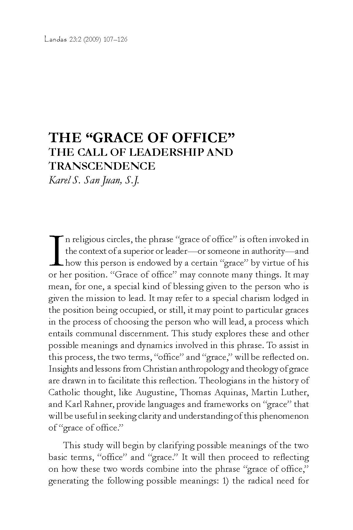 Karel San Juan reflects on the meaning of the often-used phrase “the grace of office” and relates it to the leader’s invitation to self-transcendence. – from the Editor’s Preface