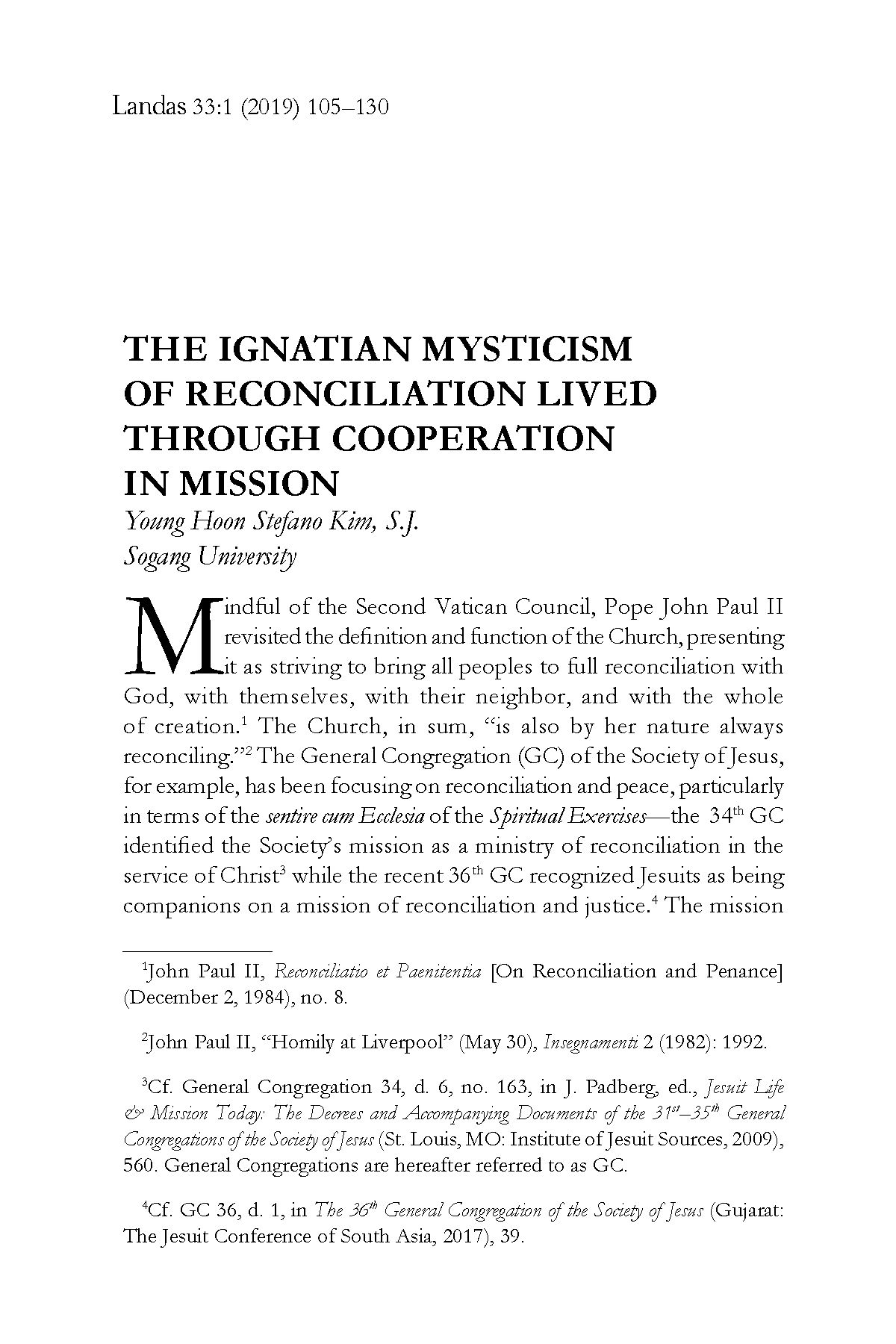Mindful of the Second Vatican Council, Pope John Paul II revisited the definition and function of the Church, presenting it as striving to bring all peoples to full reconciliation with God, with themselves, with their neighbor, and with the whole of creation. The Church, in sum, “is also by her nature always reconciling.” The General Congregation (GC) of the Society of Jesus, for example, has been focusing on reconciliation and peace, particularly in terms of the sentire cum Ecclesia of the Spiritual Exercises—the 34th GC identified the Society’s mission as a ministry of reconciliation in the service of Christ while the recent 36th GC recognized Jesuits as being companions on a mission of reconciliation and justice. The mission of reconciliation and justice, in particular, plays an important role in the Society’s universal apostolic preferences from 2019 to 2029. – Author (first paragraph)