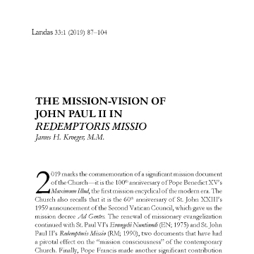 2019 marks the commemoration of a significant mission document of the Church—it is the 100th anniversary of Pope Benedict XV’s Maximum Illud, the first mission encyclical of the modern era. The Church also recalls that it is the 60th anniversary of St. John XXIII’s 1959 announcement of the Second Vatican Council, which gave us the mission decree Ad Gentes. The renewal of missionary evangelization continued with St. Paul VI’s Evangelii Nuntiandi (EN; 1975) and St. John Paul II’s Redemptoris Missio (RM; 1990), two documents that have had a pivotal effect on the “mission consciousness” of the contemporary Church. Finally, Pope Francis made another significant contribution in more recent times with his masterpiece Evangelii Gaudium, issued on November 24, 2013, the feast of Christ the King. – Author (first paragraph)