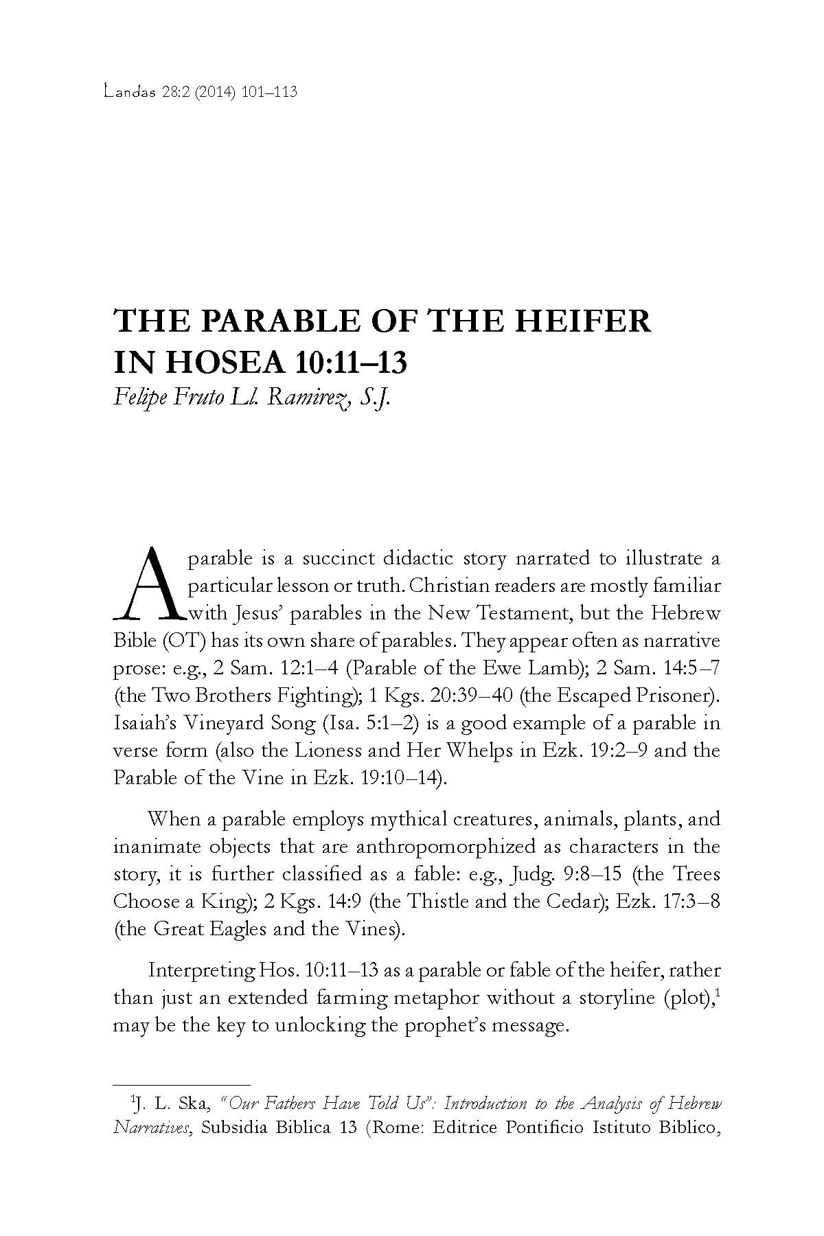 Felipe Fruto Ll. Ramirez, S.J., “The Parable of the Heifer in Hosea 10:11–13,” interprets Hosea 10:11–13 as a story rather than just an extended agricultural metaphor without a plot. The farming scene in Hos. 10:11–13 is framed by depictions of violence and atrocities in Hos. 10:9–10 and 14. The connection between the two contrasting scenes—agriculture and war—is often vaguely and tenuously explained. At best, the heifer (‘eglāh) is regarded as a veiled polemic against the bull images, disparagingly called “calves” (‘eglōṯ), of Bethel (Hos. 10:5; cf. 1 Kgs. 12:28–30, 32) and Samaria (Hos. 8:5–6; cf. 13:2). The author demonstrates that reading the text as a parable, a poetic narrative with a storyline, is better able to elucidate the prophet’s anti-war rhetoric. – from the Editor’s Preface