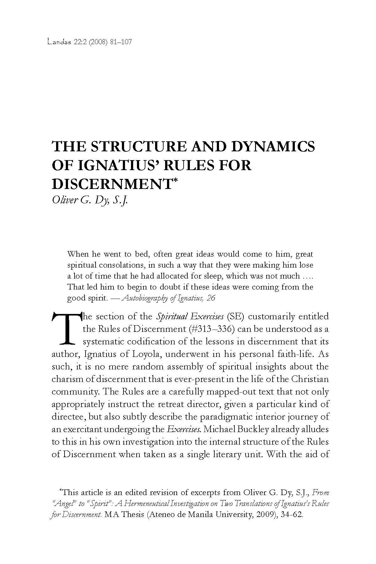 Oliver Dy’s contribution is a technical discussion of the Rules for Discernment of Spirits in the Spiritual Exercises of St. Ignatius. These so-called Rules are intended to help those attentive to their spiritual life as they contend with many and often opposing thoughts and feelings. Dy’s essay begins with the work of Ignatian scholar Michael Buckley on the structure and dynamics of the Rules and expounds on their nature and application at different points in one’s spiritual journey. – from the Editor’s Preface