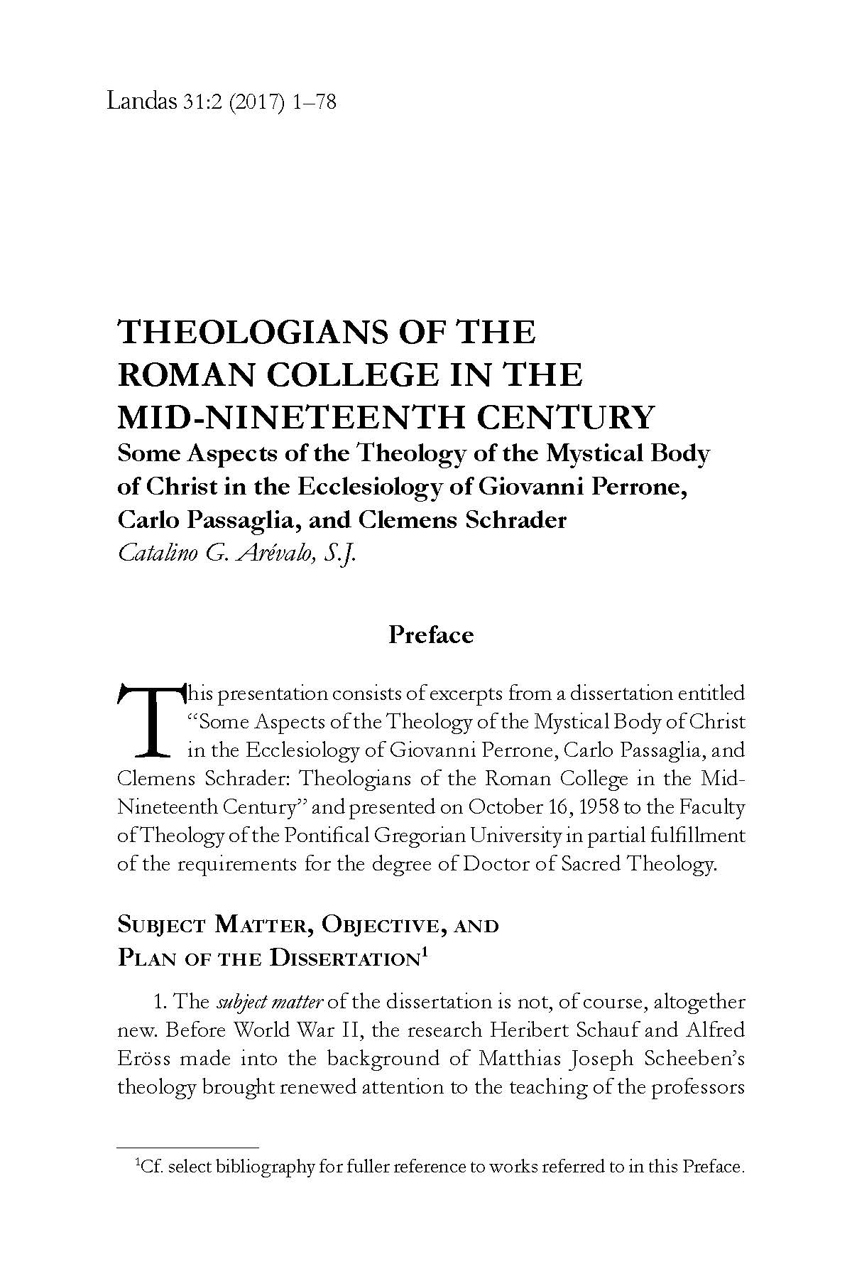 To commemorate the 75th anniversary of Mystici Corporis Christi, this issue of Landas features excerpts from the two-volume doctoral dissertation of R.P. Catalino G. Arévalo, S.J. on the Ecclesiology of Giovanni Perrone, Carlo Passaglia, and Clemens Schrader (Rome: Pontifical Gregorian University, 1959). These excerpts focus in particular on Some Aspects of the Theology of the Mystical Body of Christ in the ecclesiology of these theologians of the Roman College in the mid-19th century. – from the Editor’s Preface