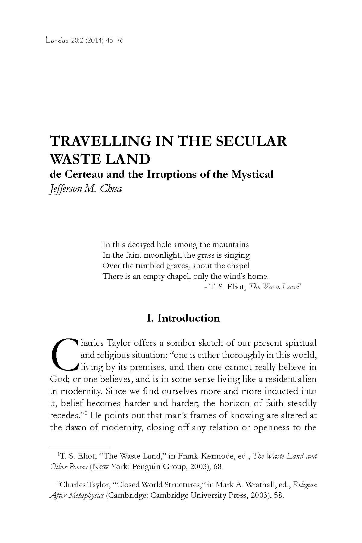 Getting a cue from the seminal works of Michel de Certeau, Jefferson M. Chua, “Travelling in the Secular Waste Land: de Certeau and the Irruptions of the Mystical,” explores how mystical discourse can help people navigate the rough seas of divergent faith-modalities in the postmodern age or the arid terrain of a secular world where faith has withered. Chua finds “two elements in mystic utterance—excess and exile—that showed both 1) their context of loss and degradation but also 2) an establishment of a space where an encounter with the Divine reorders the economies of knowledge and faith” (73). In this way the language of mysticism opens up a space for the transcendent to break forth into the secular sphere. – from the Editor’s Preface